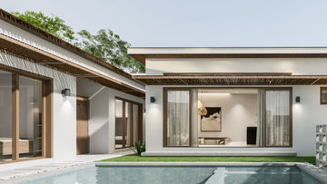 The Design is a minimalist bali inspired. It uses light colors, wood tones, concrete finished flooring, and bamboo strips for canopies and fence design.